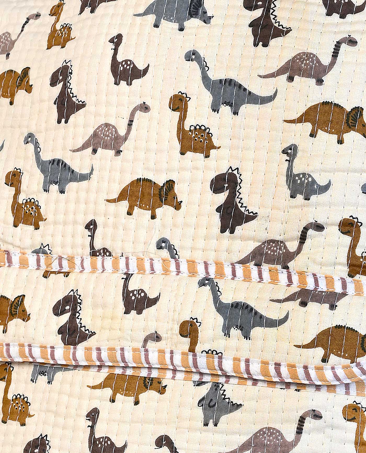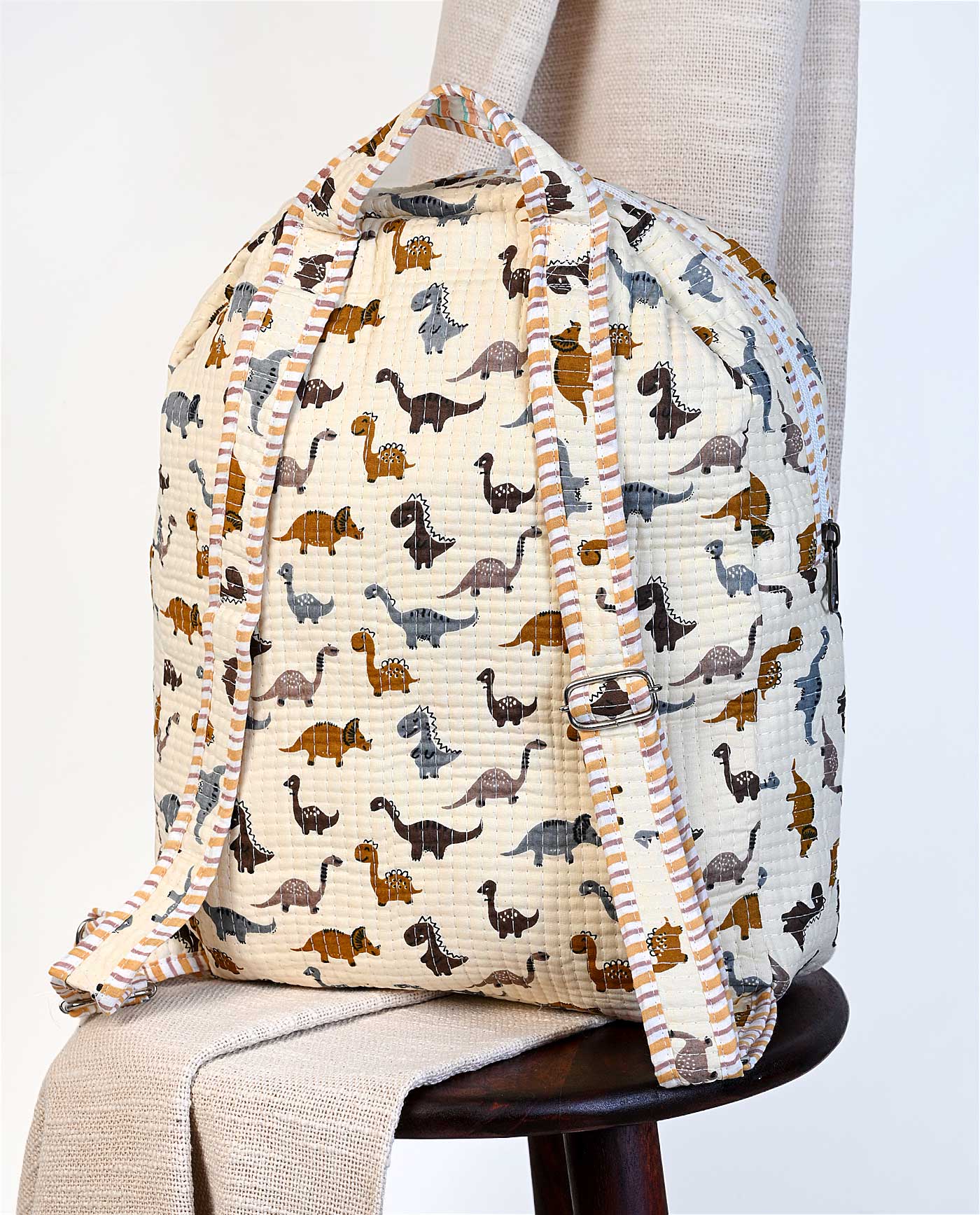 Quilted cotton backpack with cute dinosaur print – soft, lightweight, roomy, and secure with zip closure.