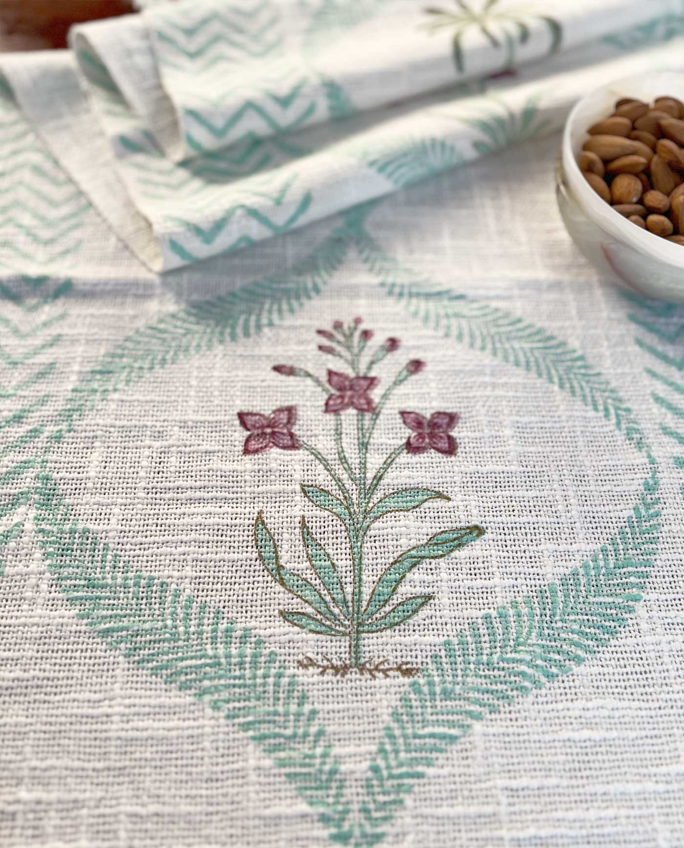 Rooted in the elegance of Jaipur’s block printing tradition, these table runners are brought to life on a jute-feel cotton base. With soothing green florals and natural vegetable dyes, adds a touch of handcrafted charm to your dining moments.