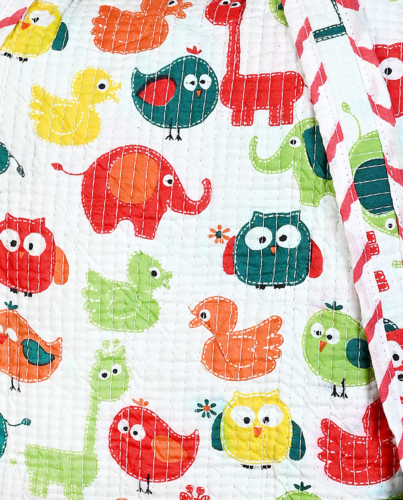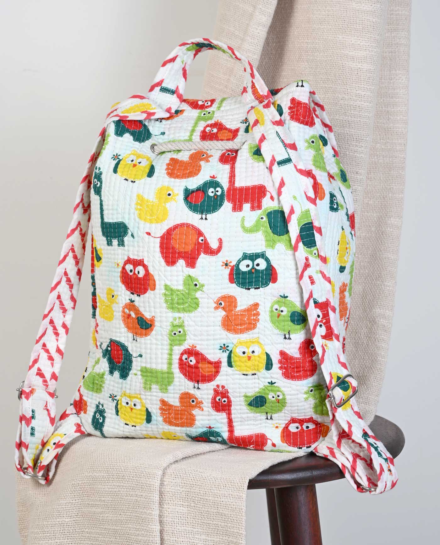 A quilted cotton bag with colorful block-printed animals – eco-friendly, modern-Indian design with secure string closure.